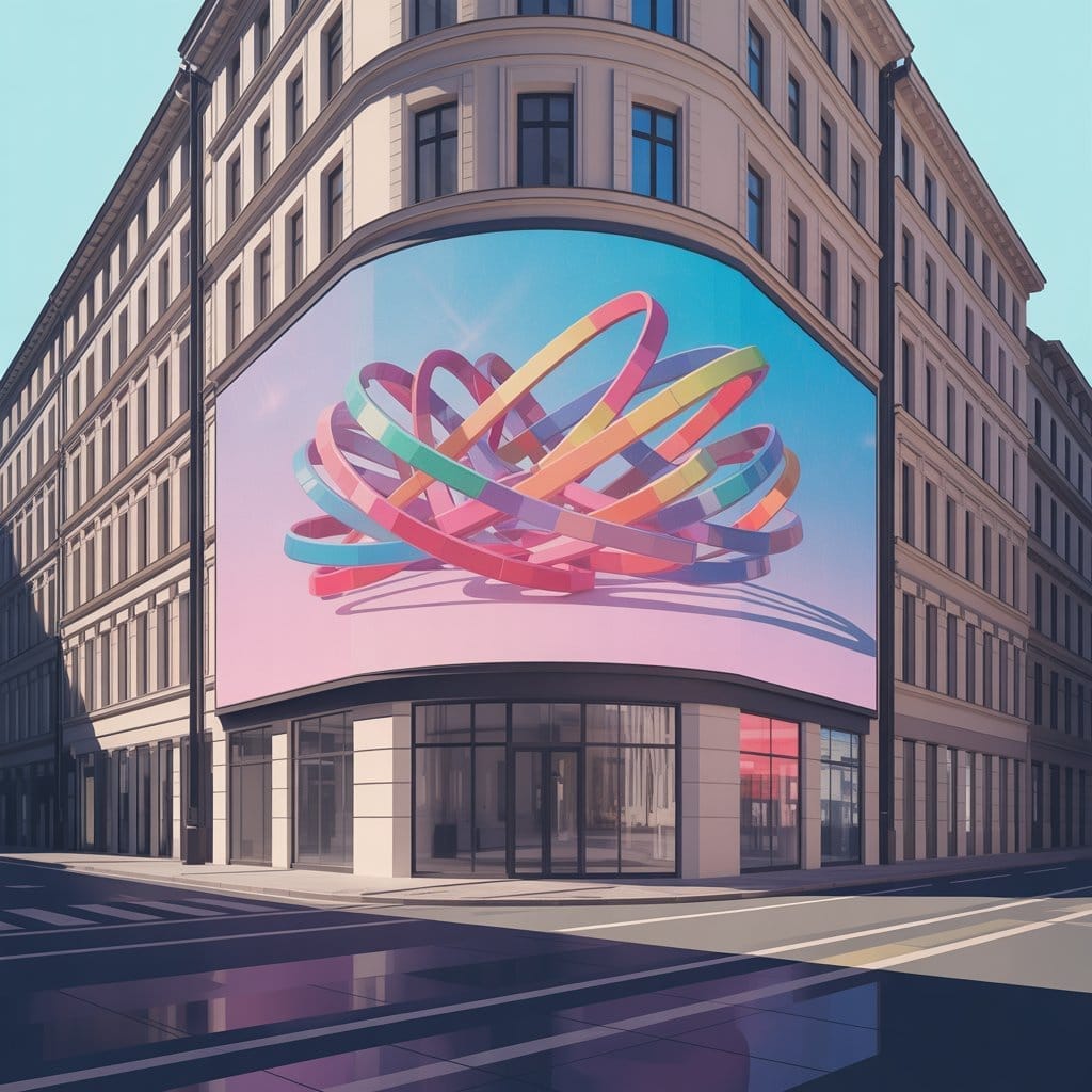 La nostra pantalla corba a la cantonada Bergé és perfecta per a creatius 3D anamòrfics: peces de vídeo que, des d’un punt de vista concret del vianant, creen la il·lusió que l’objecte surt de la pantalla.