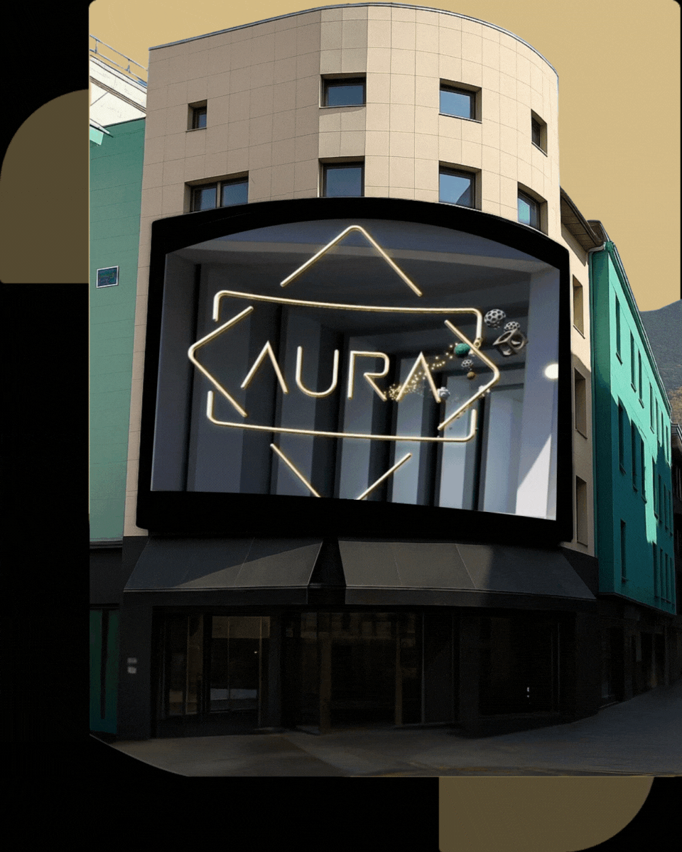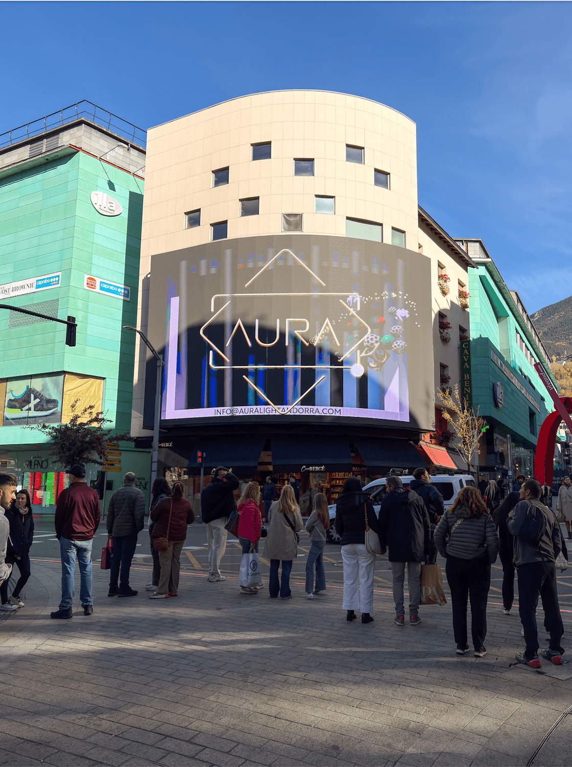 La pantalla AURA està situada en la cruïlla més transitada d’Andorra (Carlemany × Carrer de la Unió). De mitjana hi passen uns 7.000 vianants diaris, però durant Nadal, rebaixes i altres dates assenyalades la xifra es dispara. Segons els registres oficials d’Andorra Turisme recollits per Altaveu, l’any 2024 van entrar al país 9,6 milions de visitants i només al desembre 824.694 persones. Altres registres indiquen que, durant el dia de Sant Esteve, les avingudes Meritxell i Carlemany registraven una afluència excepcional de persones. Aquesta gran afluència multiplica la visibilitat de la pantalla en temporades d’alta ocupació.