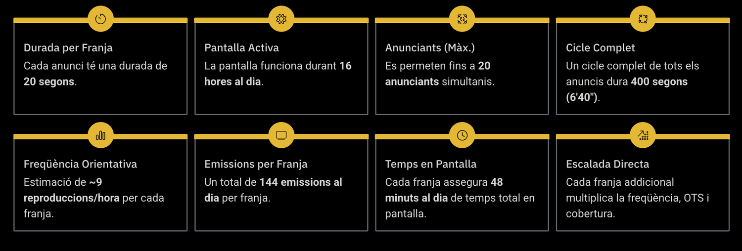 Fins a 144 emissions al dia per anunci, repartides durant 16 hores. Màxim 20 anunciants simultanis per garantir visibilitat real.